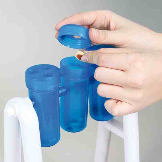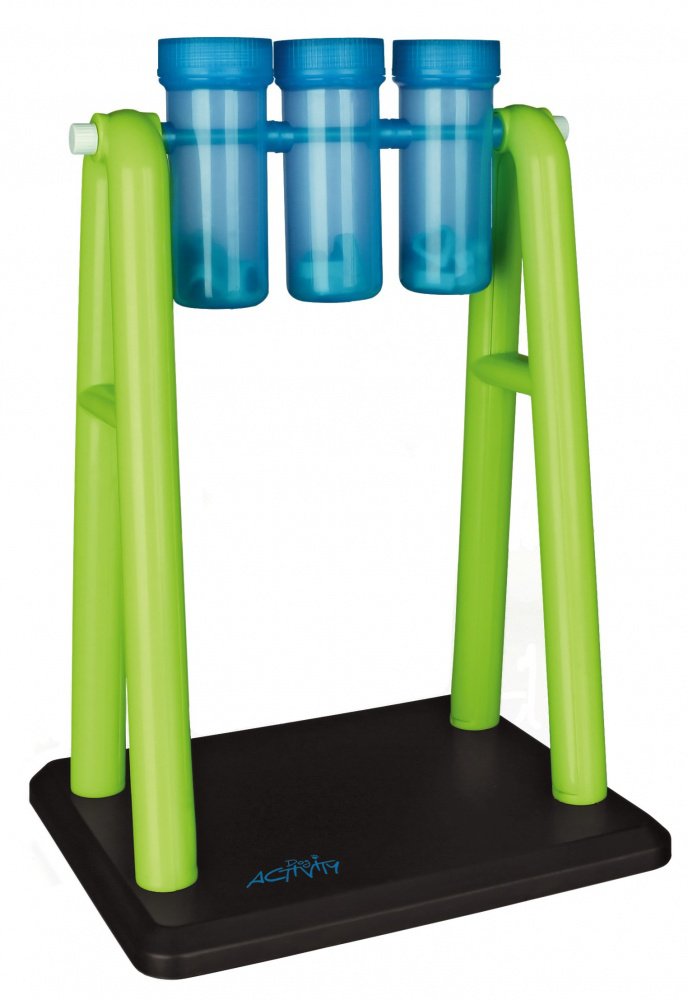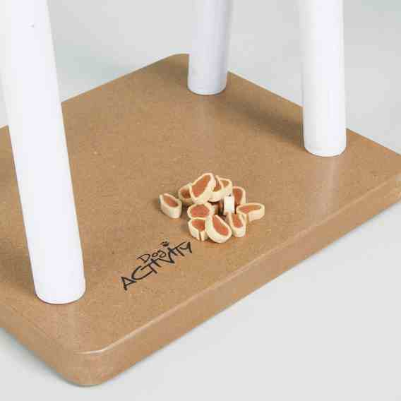 Ta niezwykle inteligentna zabawka edukacyjna została zaprojektowana specjalnie dla psów, aby zapewnić im zarówno wyzwanie intelektualne jak i ćwiczenie zręcznościowe. Składa się z ciężkiej i solidnej drewnianej podstawy oraz 3 pojemniczków na obrotowym drążku, umieszczonych na szerokich ramionach przykręcanych do podstawy. Pokrywki pojemniczków wyposażono w otwory (w komplecie 2 pokrywki - jedna z 3 małymi otworami oraz jedna z pojedynczym, większym otworem). Po wsypaniu do pojemniczków karmy lub przysmaków, pies musi zręcznie obrócić pojemniczek aby przysmaki wysypały się. Nie jest to jednak proste. Środek ciężkości został tak wymierzony, że pojemniczek zawsze wraca spodem do dołu, i wykonanie pełnego obrotu wymaga trochę zręczności. Zabawka jest wykonana z grubego i solidnego tworzywa sztucznego oraz drewna. Ramiona są przykręcane do podstawy za pomocą śrub, dzięki czemu zabawka nie rozpadnie się, nawet jeśli zostanie wywrócona przez bardziej żarłoczne psy. Dzięki tym cechom zabawka stanowi zarówno wyzwanie jak i rozrywkę dla psa i pomaga rozwijać jego zręczność i inteligencję na wiele różnych sposobów. Zabawka zapewni psu wiele zróżnicowanej pod względem poziomu trudności rozrywki w bardzo przyjemny dla niego sposób - za pomocą smakołyków i zabawy. Doskonale nadaje się do podawania nie tylko przysmaków, ale również zwykłej karmy. Zamiast napełniać psią miskę, napełnijmy karmą zabawkę, piesek lub pieski będą miały znacznie więcej rozrywki oraz może to znacząco wpłynąć na ilość każdorazowo pochłanianej karmy.