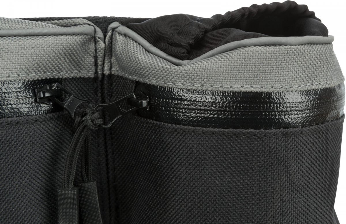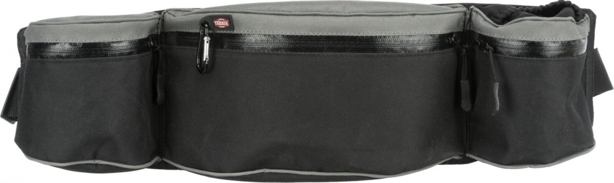 Trixie "Dog on Tour" to wielofunkcyjny pas biodrowy dla psa, który posiada wiele praktycznych funkcji. Wygodny i łatwy w czyszczeniu, wykonany z wodoodpornego materiału, chroni zawartość przed wilgocią podczas spacerów w deszczowe dni. Pas posiada wiele kieszeni na akcesoria, w tym dużą kieszeń na przysmaki lub zabawki, małą kieszeń na drobiazgi oraz kieszonkę na telefon. Dodatkowo, pas wyposażony został w specjalny brelok do przypięcia smyczy, kluczy i innych przedmiotów oraz zapięcia na rzepy i suwaki. Doskonałe rozwiązanie dla profesjonalnych hodowców, amatorów oraz podczas zawodów typu "agility". Obwód pasa wynosi 62-125 cm, a kolor pasu to elegancki czarny z szarymi elementami.