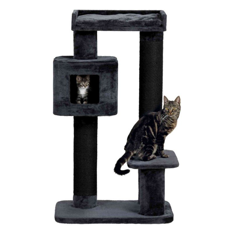 Stojący drapak dla kota w modnej kolorystyce. Wielopoziomowy drapak dla kotów. Podstawą jest solidna drewniana płyta z której wyrastają potężne wałki sizalowe, na których umieszczona jest platforma, budka oraz legowisko. Żaden kot nie będzie się nudzić na tym drapaku.