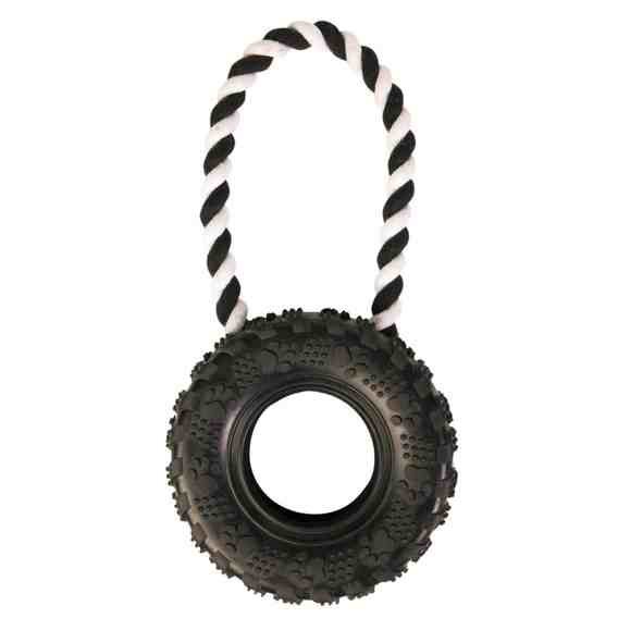 Koło gumowe na sznurku dla psów. Doskonale nadaje się jako gryzak lub do zabawy w aportowanie i przeciąganie. Sznurek zakończony pętlą na rękę zapobiega przypadkowemu ugryzieniu. Zabawka wykonana z naturalnych materiałów bezpiecznych dla zębów i dziąseł pupili. Sznurek sprawia także, że koło łatwiej rzucić i złapać. Doskonałe do nauki i zabawy ze szczeniakiem.