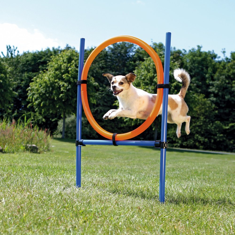 Obręcz do przeskakiwania dla zawodowców i amatorów. Przyrząd do psiego agility. Obręcz jest wykonana z trwałych tworzyw sztucznych z atestem i może być montowana na różnych wysokościach. Przyrząd składa się z dwóch słupków i koła. Po złożeniu mieści się do poręcznej torby dołączonej do produktu. Koło zręcznościowe do przeskoków jest rozwinięciem płotka zręcznościowego. Wyposażone zostało w szpilki do wbijania w ziemię z materiału nierdzewnego i pokryte warstwą ochronną. Zestaw zawiera 2 paliki, jedno koło, 2 poprzeczki stabilizujące, 4 zaczepy montażowe umożliwiające bardzo łatwe ustawienie koła po strąceniu go przez psa.