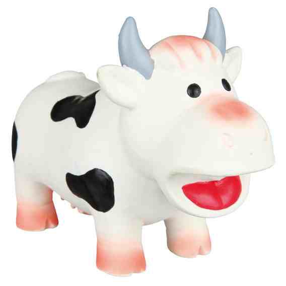 Lateksowa krowa do zabawy dla psa. Wykonana została z materiałów wytrzymałych, najlepszej jakości. Idealna dla aktywnych psów. Krowa wydaje naturalne dźwięki zachęcające Waszego pupila do dalszej zabawy. Lateks jest materiałem przyjaznym dla psich zębów, a nawet żołądków. Pogryziony na kawałki i połknięty przez psa nie zaszkodzi pupilowi, gdyż bez problemu przechodzi przez przewód pokarmowy. Lateks nie twardnieje wewnątrz żołądka lub jelit.