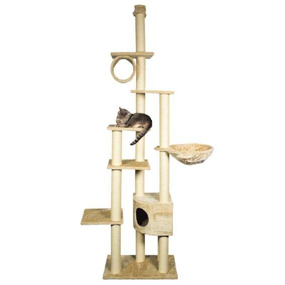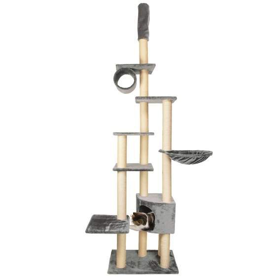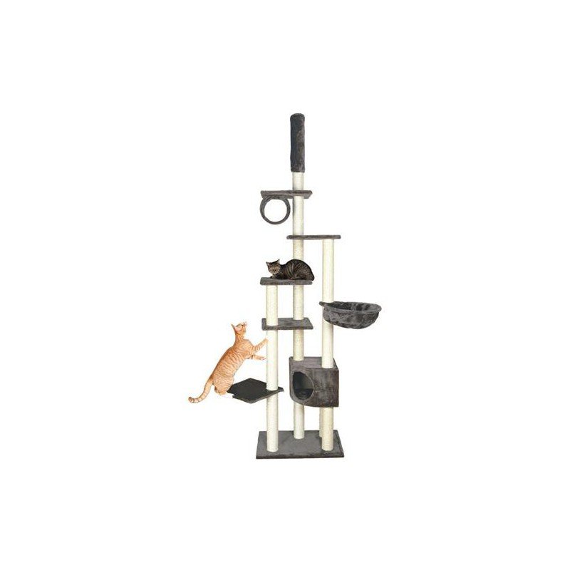 Bardzo elegancko wykończony drapak dla kotów. Drapak składa się z jednej pokrytą sztucznym futerkiem, stabilnej i szerokiej podstawy, aż pięciu półek do leżenia o różnych kształtach i wymiarach, dużego i szerokiego hamaka, budki kryjówki, tunelu oraz aż trzynastu bardzo szerokich (średnica 9.5 cm) wykończonych sizalową linką, pieńków do drapania. Bardzo estetyczny wygląd, wykończenie najwyższej jakości. Zaletą drapaka jest jego duże rozbudowanie i wysokość pod sam sufit to prawdziwa kocia dżungla, koty, które uwielbiają wspinaczkę znajdą tam wyzwanie, inne, które preferują wysokie "legowiska" będą zachwycone odpoczywając na jednej z licznych półek, przyjemnej budce i Kolejną zaletą drapaka jest stabilność - dzięki swej wysokości (drapak ma ponad 245 cm wysokości), ostatni element dokręca się do sufitu, dzięki czemu drapak jest stabilny, nie chybocze się nawet podczas szalonej zabawy, a każdy kto jest posiadaczem "futrzastych" dobrze wie, że koty uwielbiają przebywać wysoko nad ziemią, a ten drapak zapewni im maksimum swobody i zabawy. Aby uniknąć drapania mebli, tapet i dywanów, warto zaopatrzyć się w koci drapak.