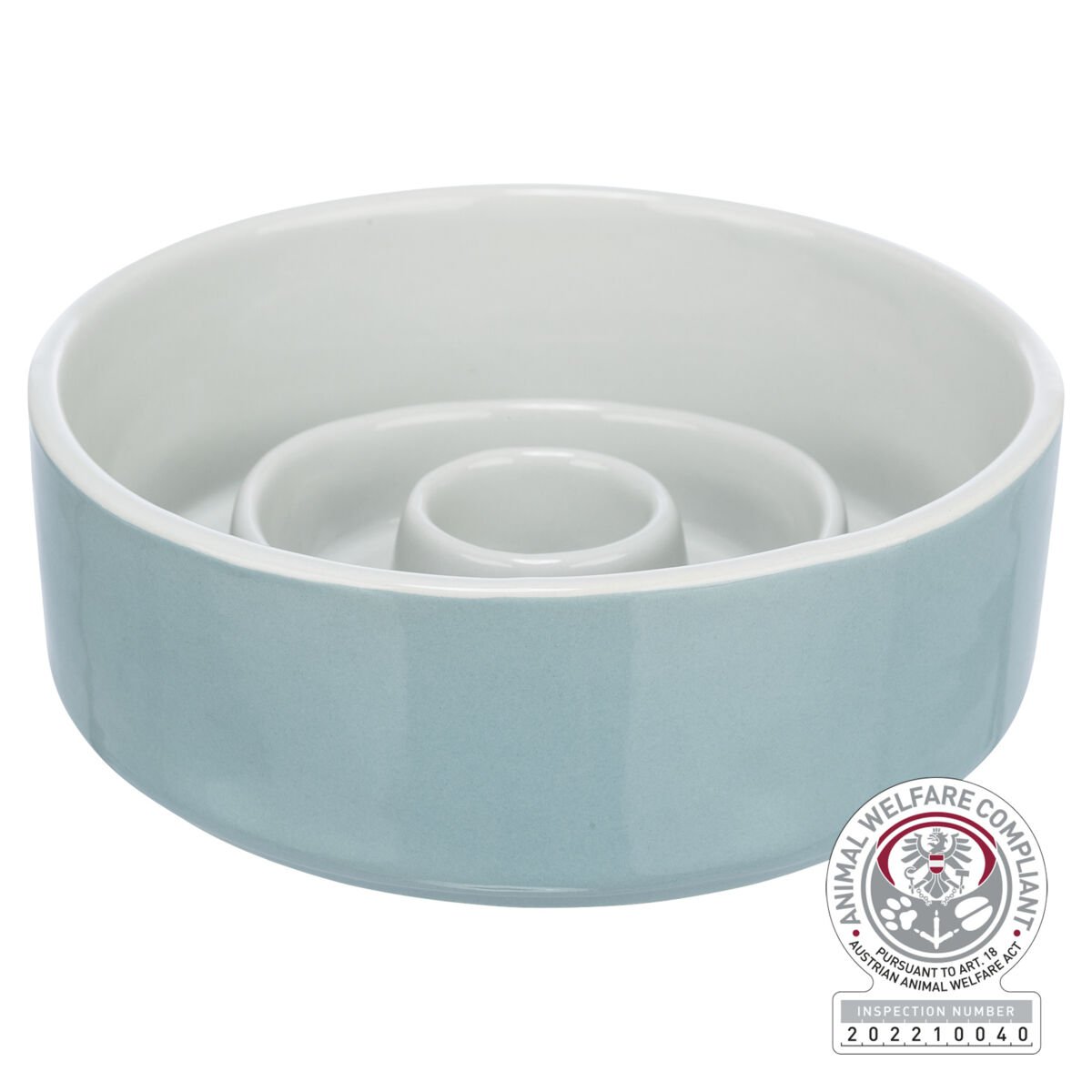Trixie Miska ceramiczna spowalniająca jedzenie Slow Feeding - zapobiega łapczywemu połykaniu pokarmu, odpowiednia do wszystkich rodzajów karmy. Zgodna z ustawą o ochronie zwierząt - §18 (AT). Można myć w zmywarce. Kolor: szaro/niebieska.