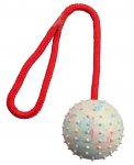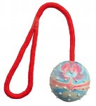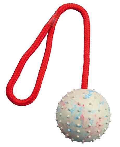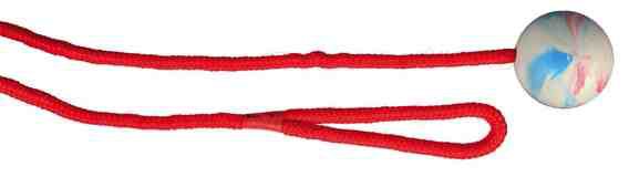 Piłka gumowa na sznurku dla psów. Doskonale nadaje się jako gryzak lub do zabawy w aportowanie i przeciąganie. Sznurek zakończony pętlą na rękę zapobiega przypadkowemu ugryzieniu. Zabawka wykonana z naturalnych materiałów, bezpiecznych dla zębów i dziąseł pupili. Sznurek sprawia także, że piłeczkę łatwiej rzucić i złapać. Doskonała do nauki i zabawy ze szczeniakiem.