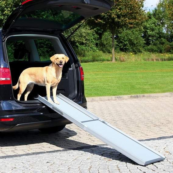 Teleskopowa rampa dla psów do samochodu. Przeznaczona dla zwierząt z problemami kostno-stawowymi. Rampa wykonana jest z wytrzymałego aluminium połączonego z tworzywem i gwarantuje udźwig do 120 kg. Pokryta jest materiałem antypoślizgowym. Przeznaczona jest dla psów mających problemy ze stawami lub kręgosłupem. Stanowi również profilaktykę tego typu schorzeń u ras mających do nich skłonność. Umożliwia sprawne wsiadanie i wysiadanie psa z auta. Jest lekka i łatwa do montażu oraz demontażu. Po złożeniu zajmuje niewiele miejsca. Jest łatwa do czyszczenia.