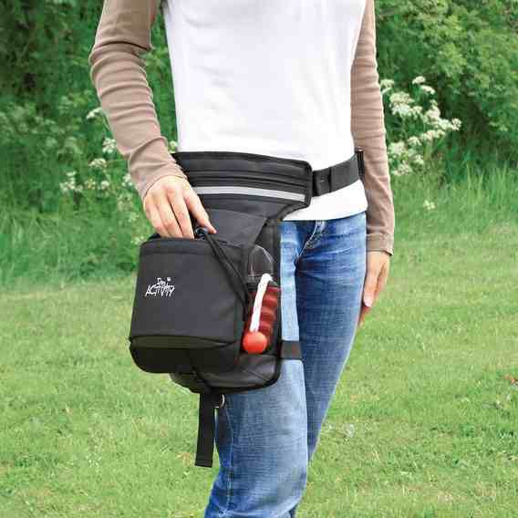 Bardzo praktyczna torba treningowa na spacer. Torbę można idealnie dopasować do swoich wymiarów, ponieważ posiada regulowane paski w pasie i na nodze. Zawiera główną komorę na duże smakołyki, oraz trzy mniejsze kieszenie na zamek. Możemy również spakować telefon komórkowy w specjalną kieszonkę którą posiada. Dodatkowo wyposażona jest w podręczną kieszeń z siatki do której mamy łatwy dostęp.
