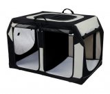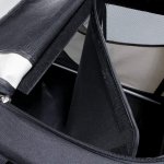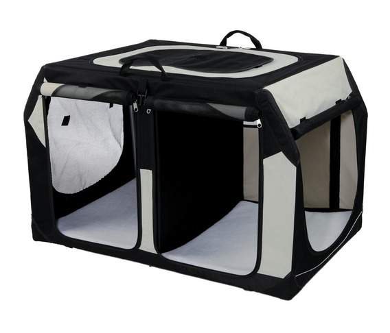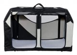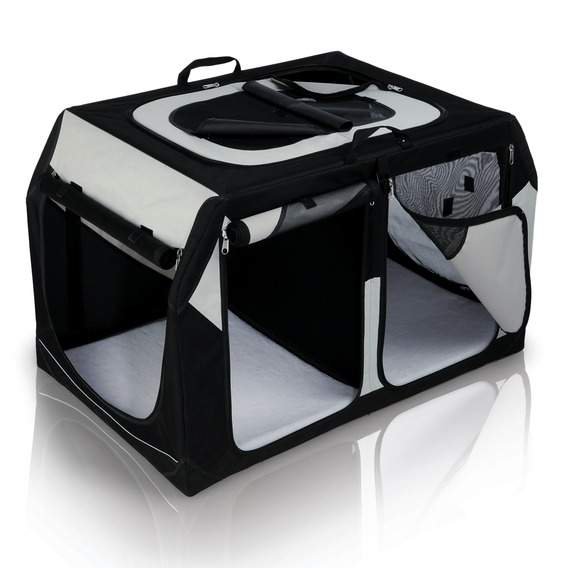 Podwójny transporter dla zwierząt wykonany z wytrzymałego poliestru. Stabilny i wytrzymały dzięki zastosowaniu wysokiej jakości metalowych ram. Istnieje możliwość otwierania go z czterech stron. Posiada specjalne wkładki zapewniające odpowiednią cyrkulację powietrza. Rozdzielacz montowany za pomocą rzepu, dzięki czemu można go usunąć. Doskonały do bagażników samochodowych. Zawiera rzepy od spodu zapobiegające przesuwaniu się oraz ochraniacz na zderzak.