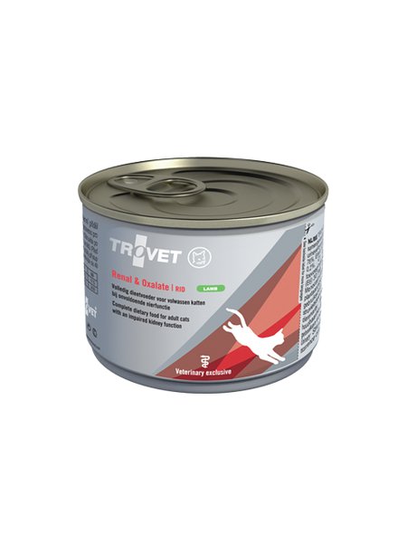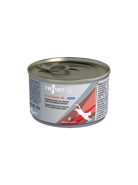 Trovet Renal & Oxalate RID to specjalistyczna mokra karma, która została stworzona w celu zapobiegania i łagodzenia zmian metabolicznych spowodowanych niewydolnością nerek, serca lub wątroby u kotów. Ta kompletna i zrównoważona dieta została dostosowana pod względem składników odżywczych, aby skutecznie wspomagać zdrowie kotów z problemami nerek i zapobiegać powstawaniu kamieni oksalatowych (szczawianów).