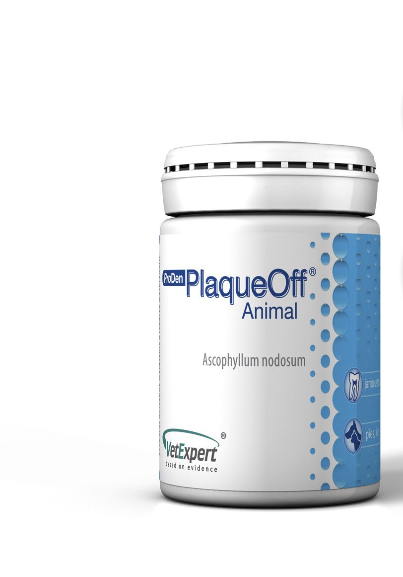 Suplementem diety do codziennego stosowania u zwierząt domowych. Uzyskiwany jest z alg pochodzących z Oceanu Atlantyckiego w północnej Norwegii. Nie zawiera dodatku cukru i środków konserwujących. Preparat w znaczący sposób redukuje płytkę bakteryjną, powstawanie kamienia nazębnego, liczbę bakterii w jamie ustnej oraz nieprzyjemny zamach z jamy ustnej. To całkowicie naturalny produkt chroniony patentem, który pomaga przeciwdziałać powstawaniu kamienia nazębnego i płytki bakteryjnej na powierzchni zębów, przez co przyczynia się do obniżenia ilości bakterii w jamie ustnej. Substancją czynną jest naturalna substancja roślinna, którą dodaje się do psiej lub kociej karmy. Podczas trawienia uwalniane są składniki, które powodują, że ślina zyskuje właściwości naruszające kamień nazębny w taki sposób, że nie daje on oparcia nowym złogom. Produkt najpierw wypróbowano na ludziach.Poprzednikiem PlaqueOff Animal jest ProDen PlaqueOff– środek, który od lat stosują tysiące Szwedów i mieszkańców innych krajów. Jak wykazały badania kliniczne przeprowadzone na ludziach, nalot na zębach uległ zmniejszeniu o nawet 88%, zaś kamień nazębny albo całkiem zniknął, albo przybrał strukturę silnie porowatą, która ułatwia jego usuwanie. Przeprowadzone badania dowodzą, że wynik jest widoczny już po czterech tygodniach. Dalsze regularne stosowanie preparatu zapewnia jeszcze lepsze wyniki