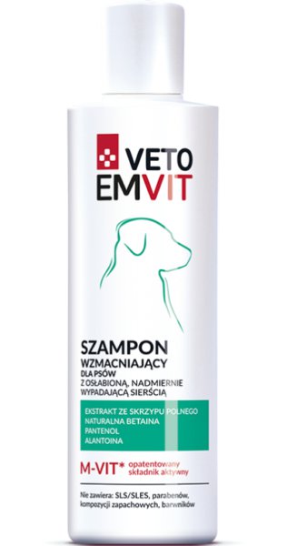 Szampon wzmacniający VETOEMVIT to innowacyjny dermokosmetyk weterynaryjny, przeznaczony dla psów z problemem osłabionej, nadmiernie wypadającej sierści oraz wrażliwej, skłonnej do podrażnień i alergii skóry. Skład preparatu oparty jest na łagodnych środkach myjących, które nie naruszają bariery hydrolipidowej naskórka i zapewniają skórze psa fizjologiczne pH (ok. 7). Dzięki opatentowanej substancji aktywnej (M-VIT) szampon wzmacnia mieszek włosowy, stymuluje odrastanie sierści i zmniejsza jej nadmierne wypadanie. Chroni skórę przed powstawaniem podrażnień oraz wspiera naturalne procesy regeneracji naskórka. Zawiera wyciągi roślinne (ekstrakt ze skrzypu polnego, naturalna betaina) o właściwościach nawilżających i ochronnych.