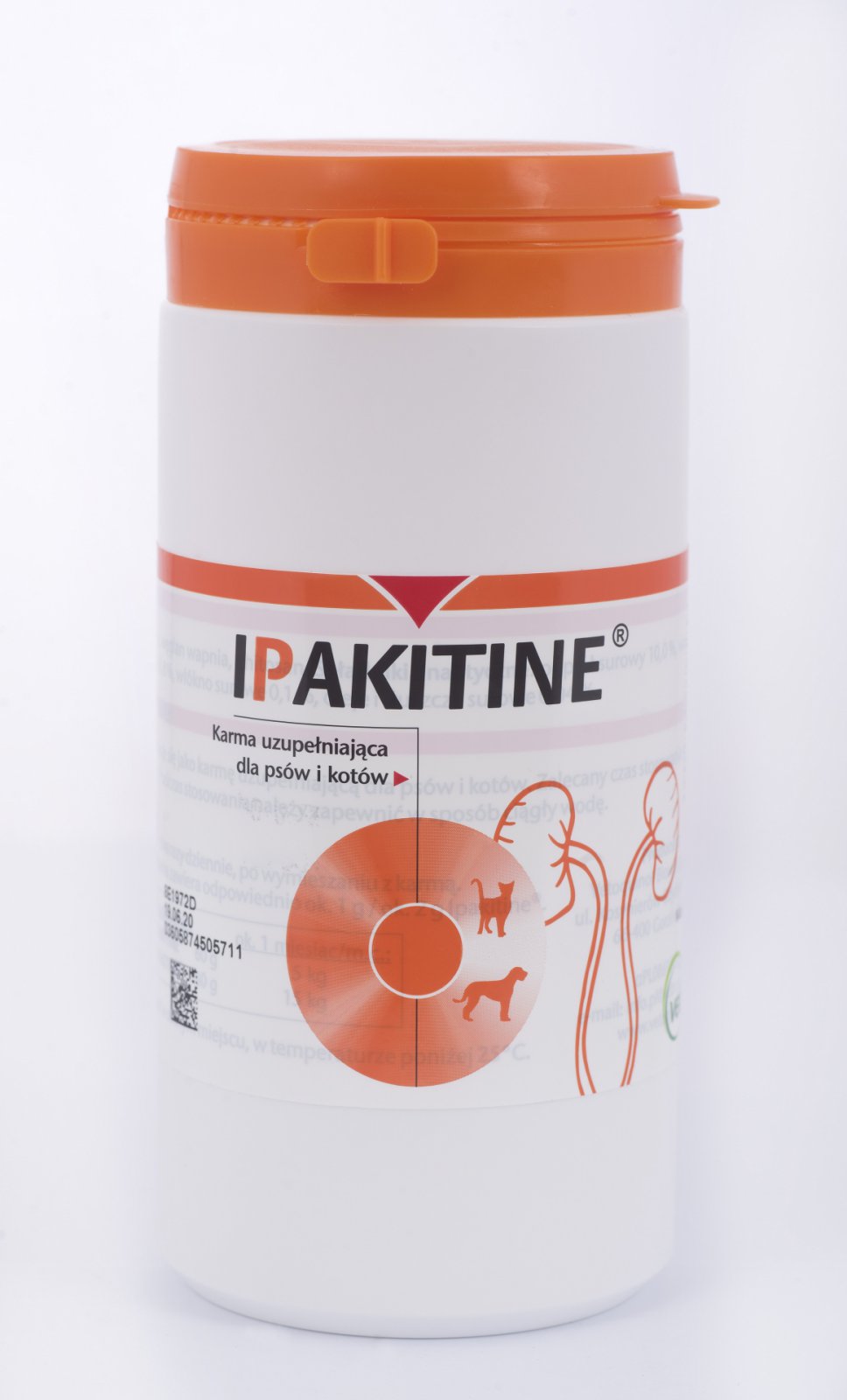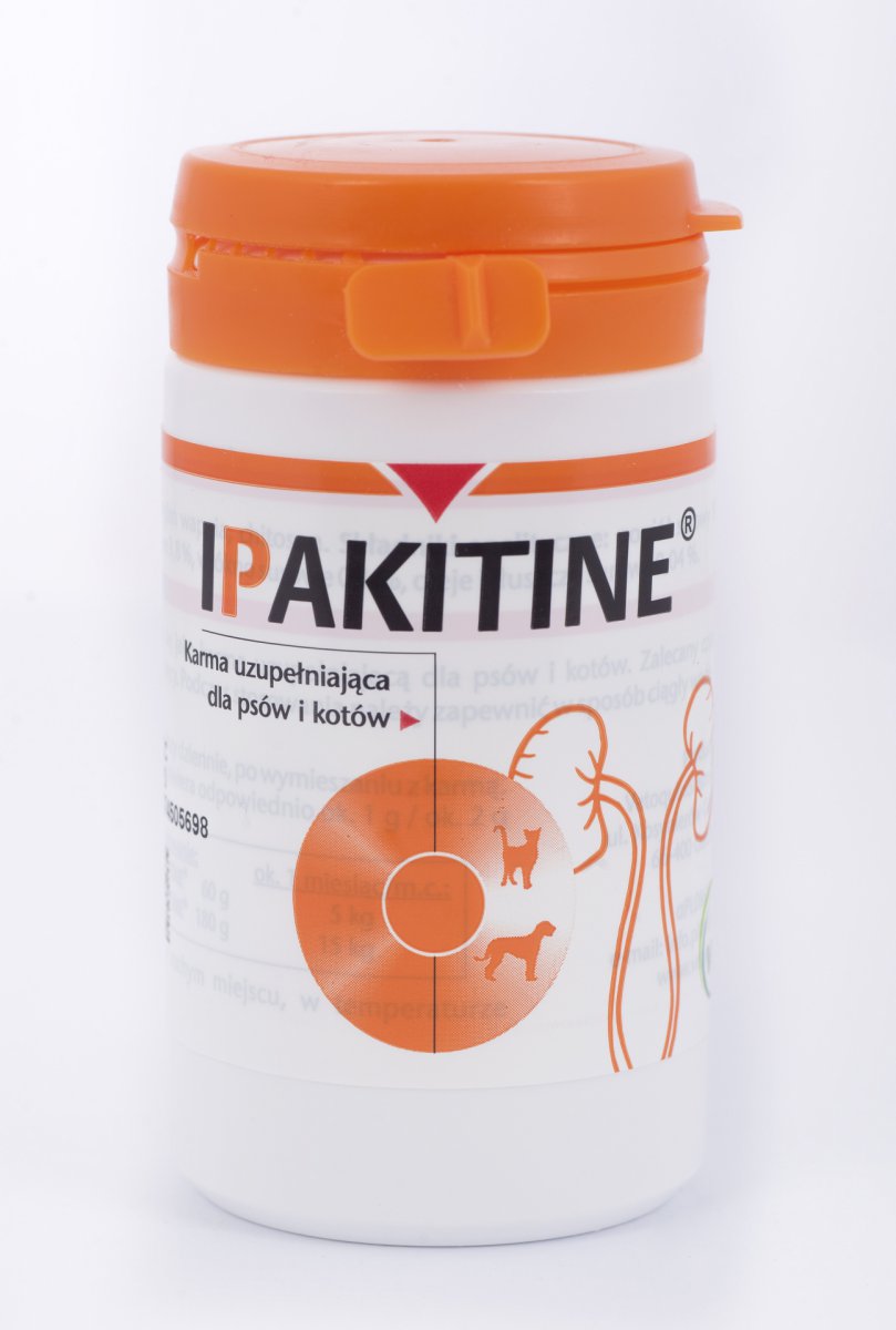 Ipakitine zawiera chitosan, który wiąże i usuwa toksyny mocznicowe. Toksyny mocznicowe są współodpowiedzialne za postępujące upośledzenie funkcji nerek. Ipakitine zawiera węglan wapnia, mający zdolność wiązania i usuwania fosforanów występujących w pokarmie mięsnym oraz we krwi. Zrównoważony bilans fosforanów wpływa pozytywnie na pracę nerek. Ipakitine jest proszkiem, który doskonale miesza się z wilgotną karmą, dzięki temu działa natychmiast, wiążąc fosforany. Preparat zaleca się stosować u psów i kotów w celu wspomagania funkcji nerek w przypadku ich chronicznej niewydolności.