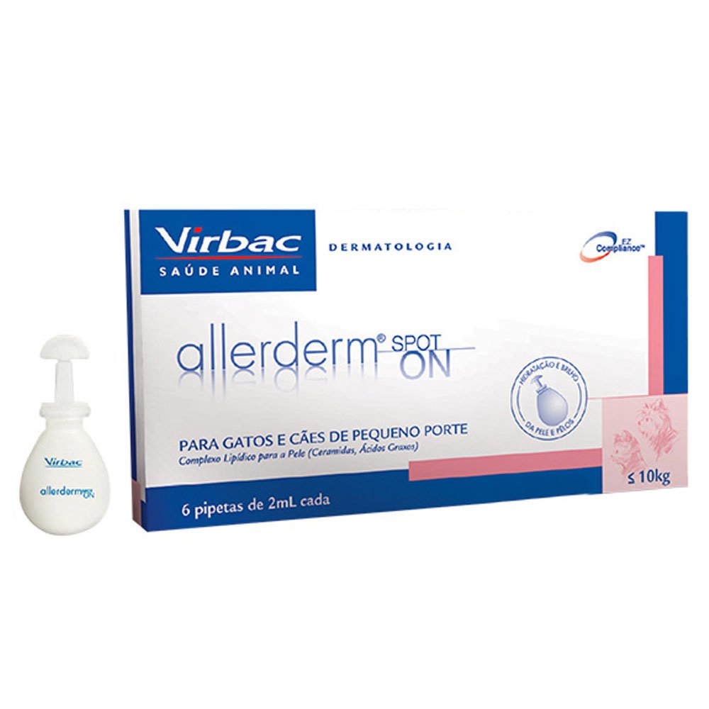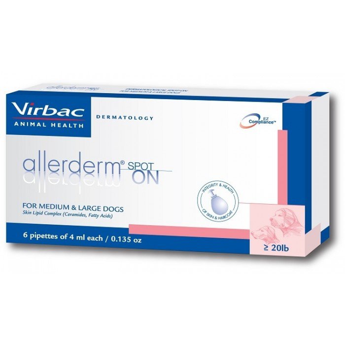 Preparat Spot-On do miejscowego stosowania przy pielęgnacji uszkodzonej skóry psów i kotów. Niezbedny w terapii wspomagającej leczenie. Przywraca ochronną barierę naskórka, powodując zwiększenie jego nawilżenia. Allerderm spot on to unikalne połączenie ceramidów, kwasów tłuszczowych i cholesterolu (Kompleks Lipidów Skórnych), podobne do tego, które jest obecne w zdrowej skórze kota i psa. Produkt do stosowania miejscowego do potrzeb zwierząt z problemami dermatologicznymi. Jest szczególnie polecany jako produkt wspomagający leczenie chorób skóry psów związanych z pojawieniem się zmian na jej powierzchni.