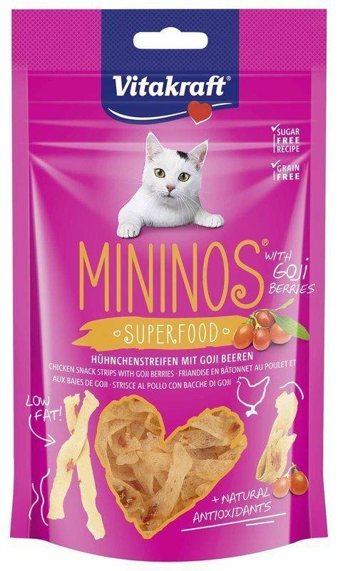 Cienkie plasterki z kurczaka i jagodami goji to rewelacyjny przysmak dla kota. Idealny smakołyk do podawania między posiłkami. Charakterystyczną cechą przysmaku Vitakraft Mininos to bardzo wysoka zawartość mięsa, która przekracza 90%. Opakowanie przysmaków zawiera strunowe zamknięcie. Dzięki temu przysmak dla kota zawsze zostanie świeży. Vitakraft Mininos nie zawiera cukru oraz zbóż. Jest to produkt niskotłuszczowy, zawierający w swoim składzie antyoksydanty.