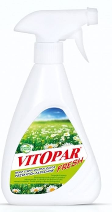 Biologiczny neutralizator zapachów pochodzenia organicznego. Przy jego produkcji zastosowano bakterie saprofityczne i enzymy, które szczególnie aktywne są wobec związku azotu i siarki zawartych w moczu, kale oraz innych pozostałościach zwierzęcych. Działa natychmiast. Nie jest dezodorantem.. Można stosować w obecności zwierząt. VITOPAR FRESH nie pozostawia plam, nie odbarwia, można stosować bezpośrednio na tkaniny obiciowe, skórzane, dywany powierzchnie lakierowane. Zawiera mikroorganizmy nieszkodliwe dla środowiska, ludzi i zwierząt (dyrektywa EU 1999/45/CEE).