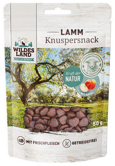 Przekąska Wildes Land Knuspersnack to pyszny chrupiący przysmak z jagnięciną i jabłkiem, który zachwyca swoją wysoką akceptacją ze względu na zawartość świeżego mięsa jagnięcego. Dzięki specjalnej produkcji, ta przekąska bezzbożowa jest niezwykle chrupiąca, dodając radości do codziennego życia Twojego kota i wzmacniając więź między Wami.