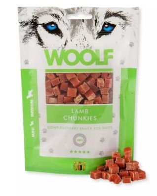 Woolf Lamb Chunkies smakowite kwadraciki z jagnięciny. Naturalna, mięsna przekąska dla Twojego pupila. Smakowite kosteczki zwierają mięso z jagnięciny.