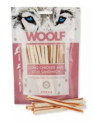 Woolf Long Soft Chicken and Cod Sandwich długie paseczki z mięsa kurczaka i dorsza Naturalna, mięsna przekąska dla Twojego pupila. Smakowite paseczki zwierają mięso z kurczaka i dorsza.