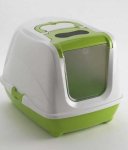 Kryta kuweta dla kota. Ścianki i uchylane drzwiczki zapobiegają rozsypywaniu się żwirku oraz zanieczyszczeniu najbliższego otoczenia przez kota.